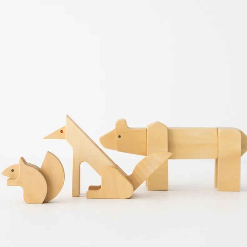 The color of the recycled paper stripes are specific to each animal: blue for the bear, orange for the fox and green for the squirrel. The rectangle-based brown bear consists of six pieces, the circle-based squirrel four, and the triangle-based north fox two. Each piece is handmade, and there may be some color variation throughout the cross-sections of the Paper-Wood. Each piece will have a slightly different grain.