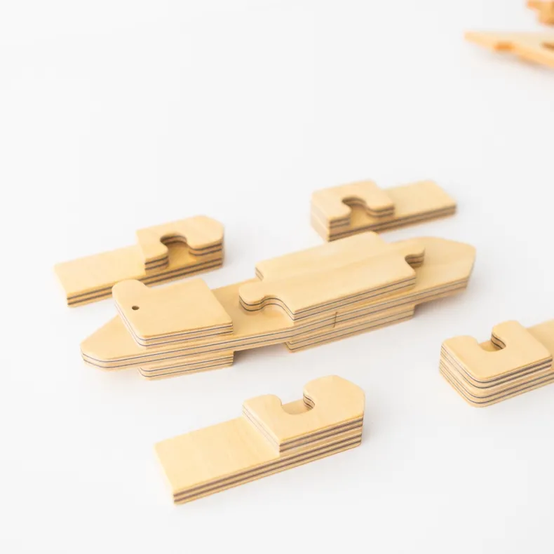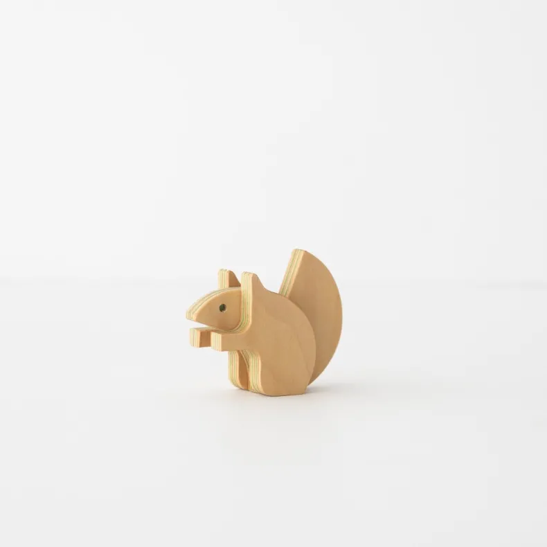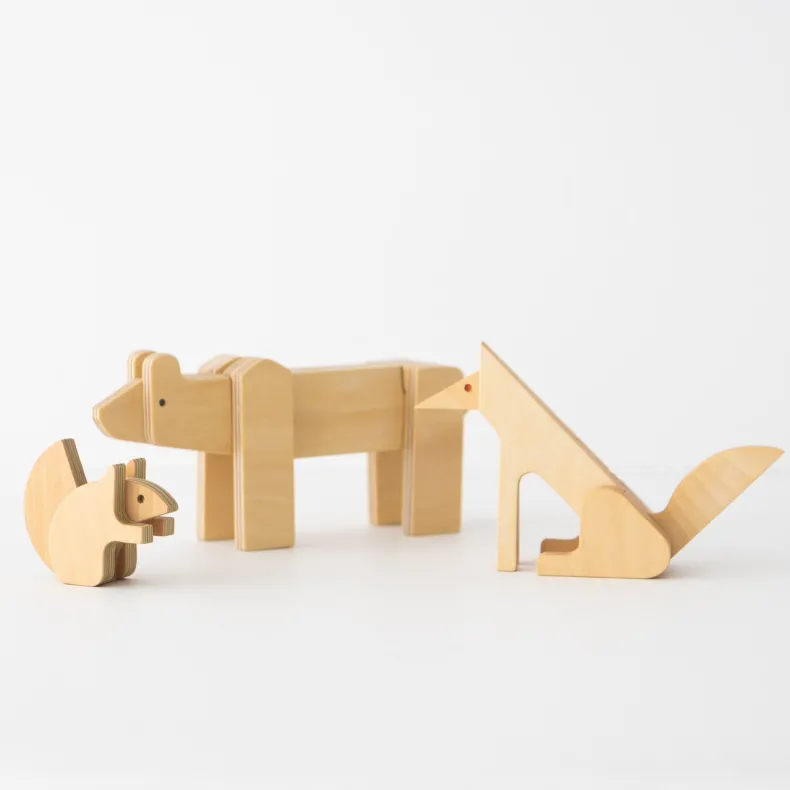 These 3D geometric jigsaw puzzles by Takizawa Plywood feature three forest animals native to Hokkaido: the Ussuri brown bear, the Ezo red fox and the Ezo Risu Hokkaido squirrel. The elegant and playful stripes at the edges of each piece reflect the alternating layers of colored recycled paper and wood veneer used in the plywood’s construction. Known as Paper-Wood, this innovative hybrid material was invented in Takizawa’s PLYWOOD laboratory in Hokkaido, the northernmost prefecture in Japan known for paper production and woodworking.