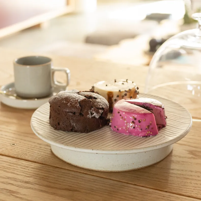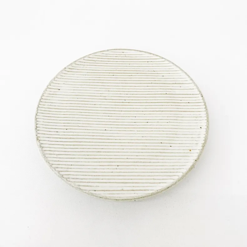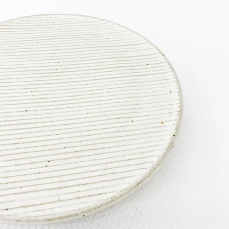 This softly glazed cake stand is a charming way to display cakes or other baked goods. The stand’s wide top is etched with a delicate geometric line pattern, and has a slightly ridged texture. It is supported by a smaller, evenly glazed base for convenient carrying and a slight floating effect for the cake.