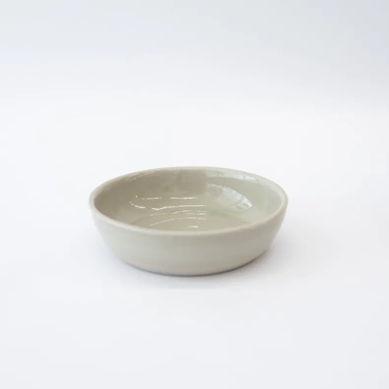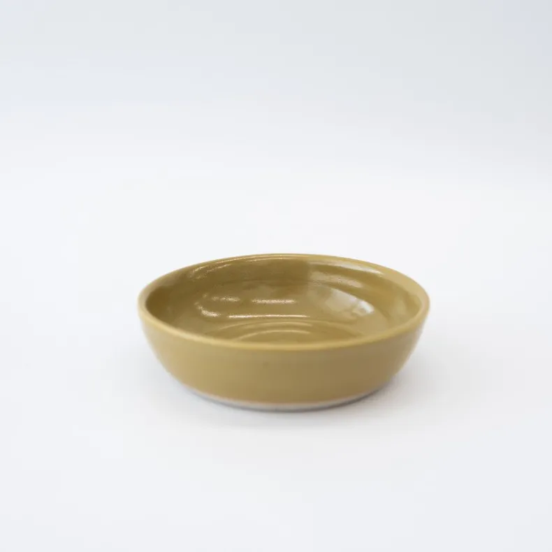 Minimalist ceramic plate with three different glazes; a warm mustard, speckled wreath, and the classic mist grey. These coupe plates have the base that has been left unglazed as a signature design feature of WRF. The plate rests comfortably in your hands, and is the perfect serving dish for berries, nuts, soups, rice. or any side dish. All hand-thrown on the wheel in Orange County by ceramic artist and instructor, Nobuhito Nishigahara — each plate retains its unique, one-of-a-kind feel and appearance.