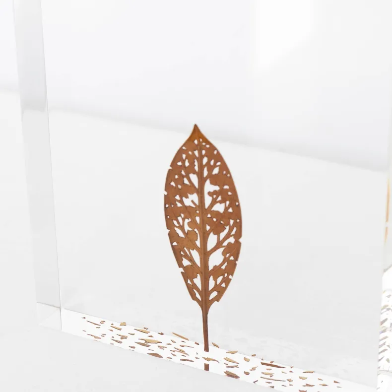 Since 2009, Mitsuru Koga has usedfoundleaves as a reoccurring material in his practice. In ‘Fallen Leaves’, Kogadisplays astaggering degree of accuracy by cutting a dried leaf by hand, evoking a tree shedding its leaves in autumn.