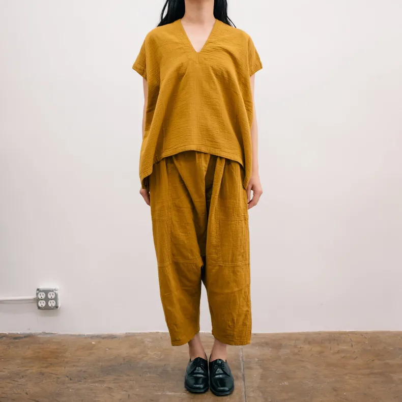 This reversible top from Atelier Delphine is a must-have for your wardrobe. It’s a versatile style featuring a boxy, relaxed fit with a slightly cropped center and naturally draping sides. Single-layered, regular-weight cotton gauze with a unique crinkled texture. 100% cotton imported from Japan. Made in the USA. Pair with the to create a matching set for a modern, Japanese-inspired look.
