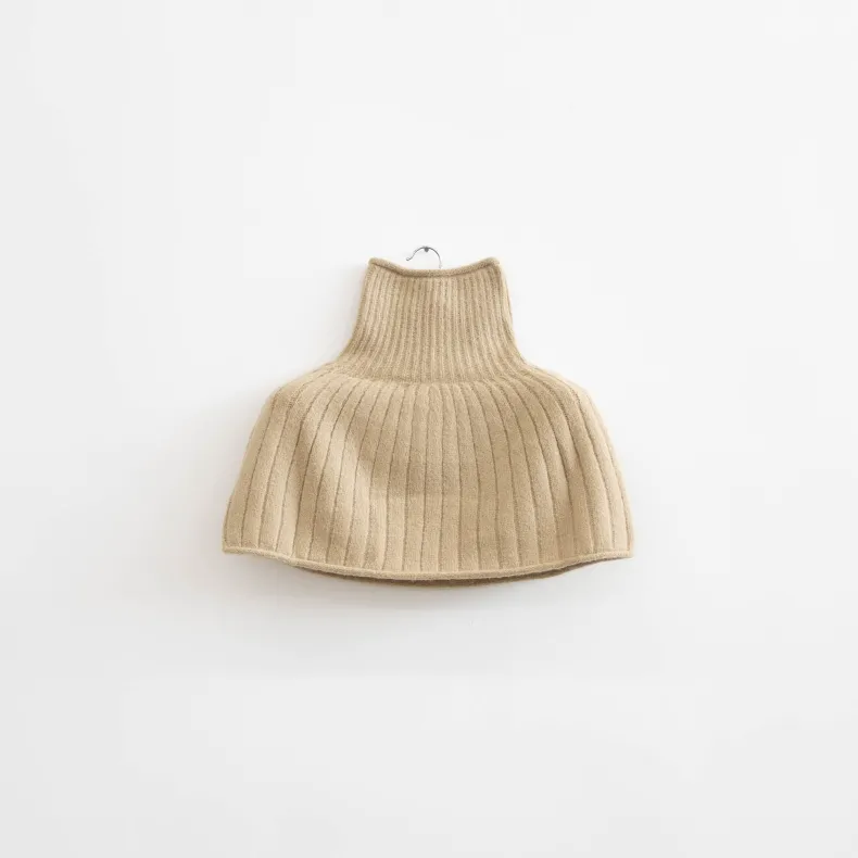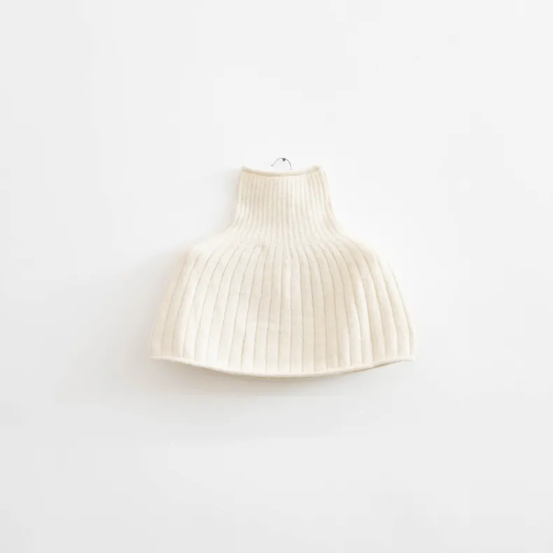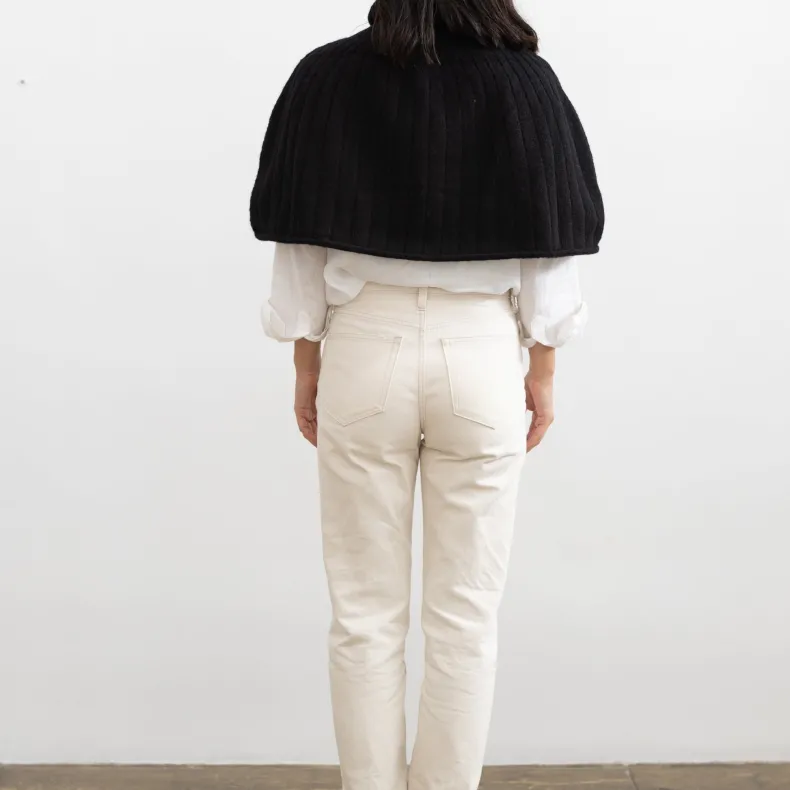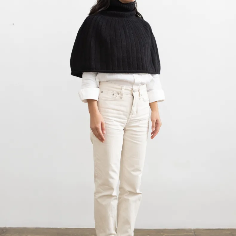 Cropped ribbed poncho in the softest supreme alpaca. A wider gauge of rib through the body is contrasted with a slimmer gauge at the elongated neck. Layer over your favorite knit in transitional weather or tuck into the neckline of your jacket as the days turn toward winter.