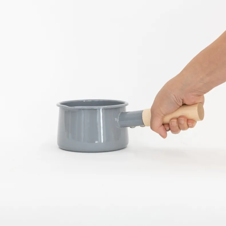 Durable and thermal efficient, this milk pan is made of enamel coated steel so you can quickly heat up your milk or other liquids, then pour out its contents easily with its lid-less feature. The wood handle means your hands are safe when you go to grab it from the stove. Enamel coating prevents rust and is effective at evenly distributing heat, however it requires some special care – please read below under “Care Instructions” for more details!