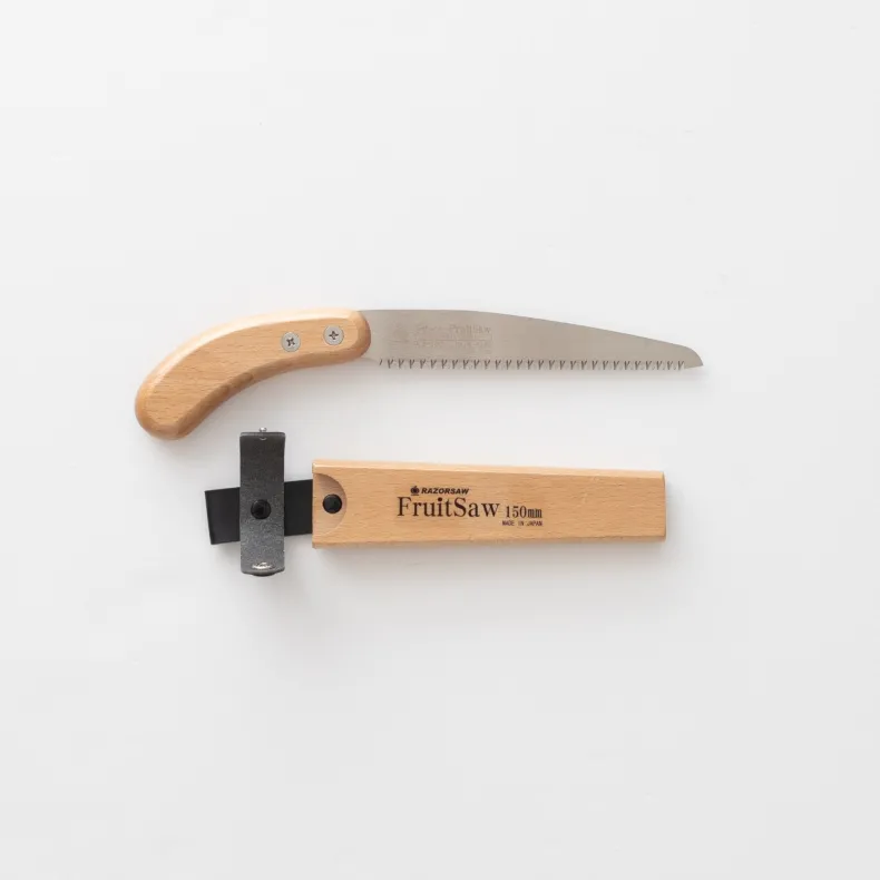 Originally designed to prune fruit trees, the Gyokucho Fruit Saw is a trusty tool for gardeners looking to encourage growth, increase fruit production, improve plant health and remove damaged limbs. A charming wood holster will keep both you and your blade safe. A leather loop allows the saw to hang off a belt for convenience.
