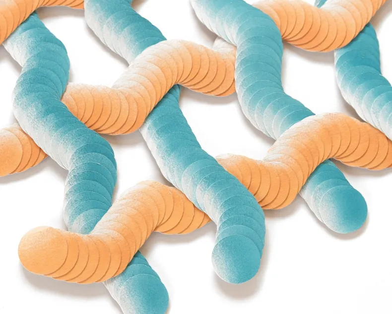 Suzuki’s artworks are carefully woven compositions of layered paper materials. Evoking a sense of movement and depth, the imbricated, intricate patterns dance between graphic design and textile art and are reminiscent of tapestries, nets, and baskets.