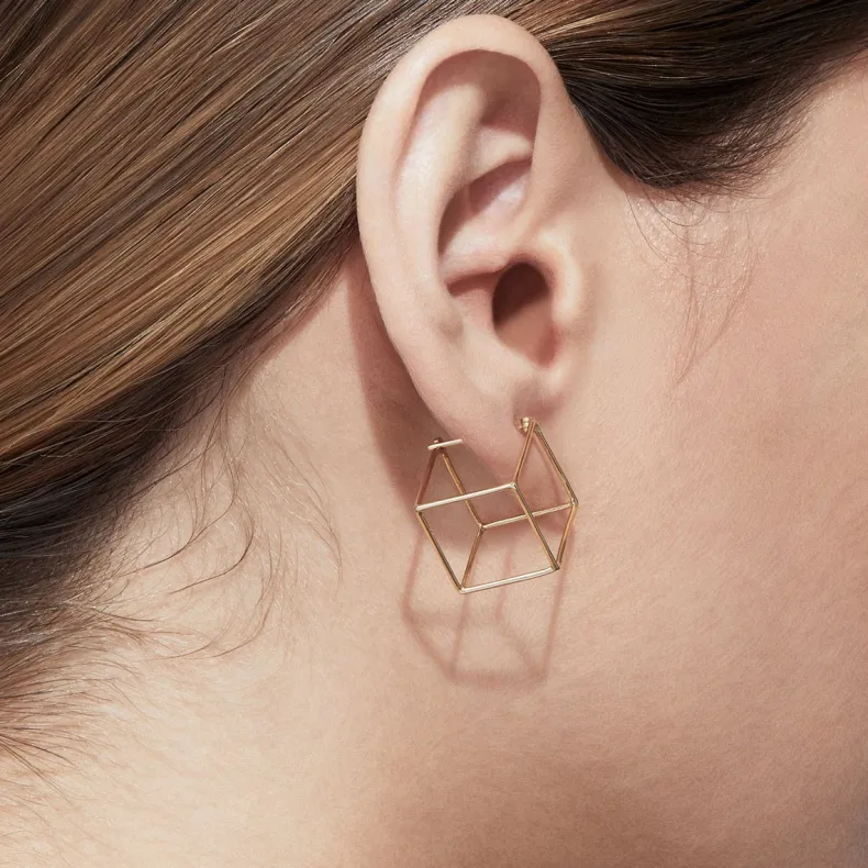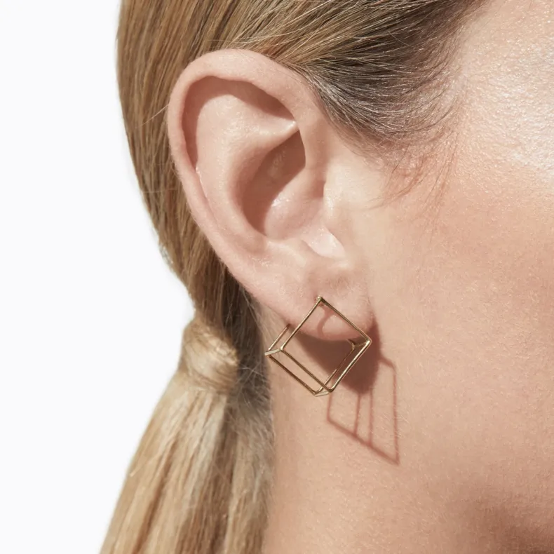 A collection of three dimensional earrings. Clean geometric forms open up into wearable pieces of jewelry. One side is an earring post and appears to float seamlessly around the earlobe when worn.