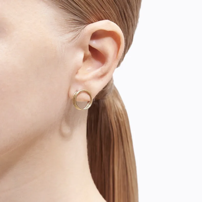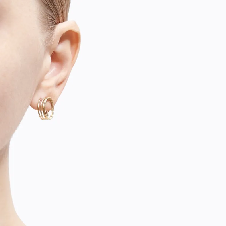 A series of coiled hoop earrings made from 9mm thin 18K yellow gold pipes. The spiraled,springy properties of the material allows one to wear the earrings in multiple ways.
