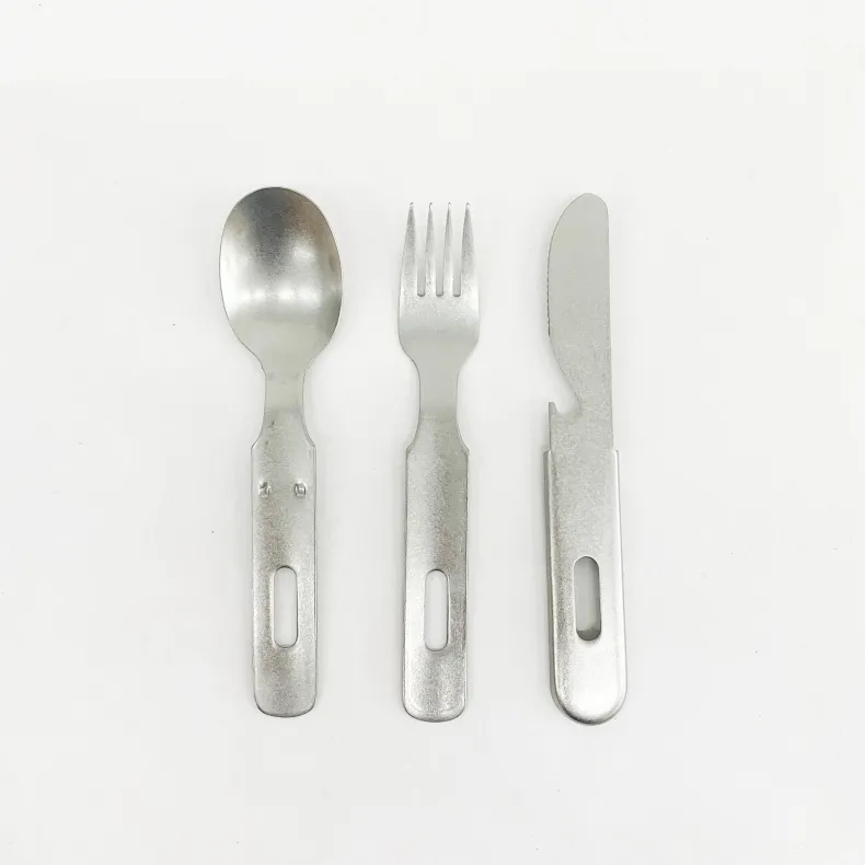 Reminiscent of a standard issue carry for soldiers, this brushed stainless steel fork, knife and spoon cutlery set that nest into each other for space saving convenience, making it ideal for traveling or camping. The knife also has a dual purpose as a bottle cap opener, a handy tool for outdoor picnics and bbqs. Toss it into your packed lunch or keep in your office bag if you’re taking food from home!