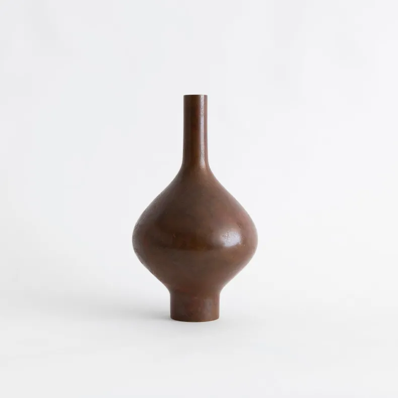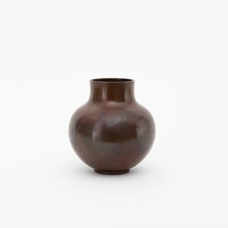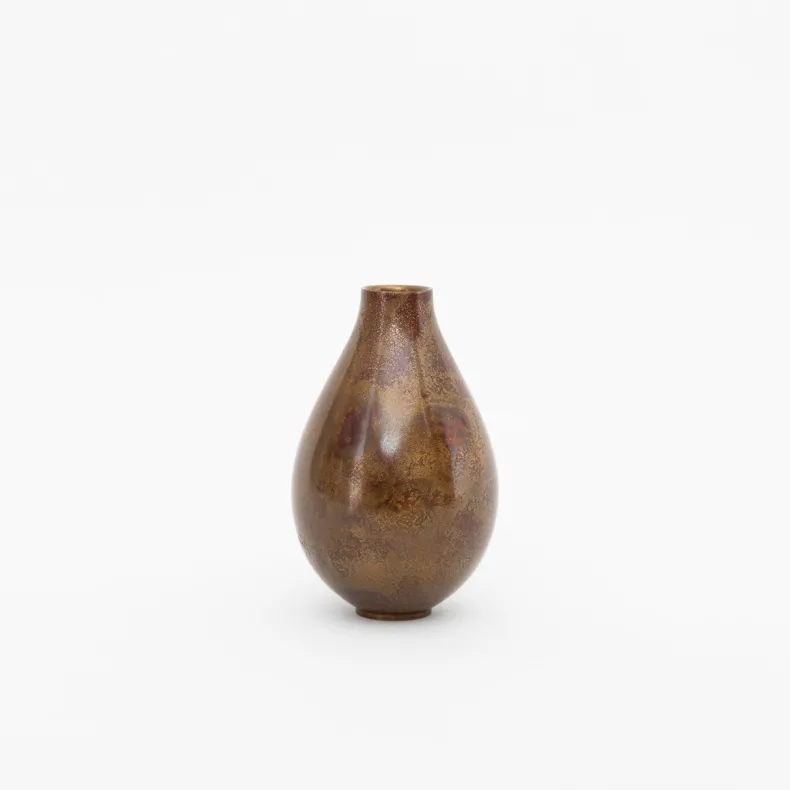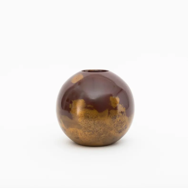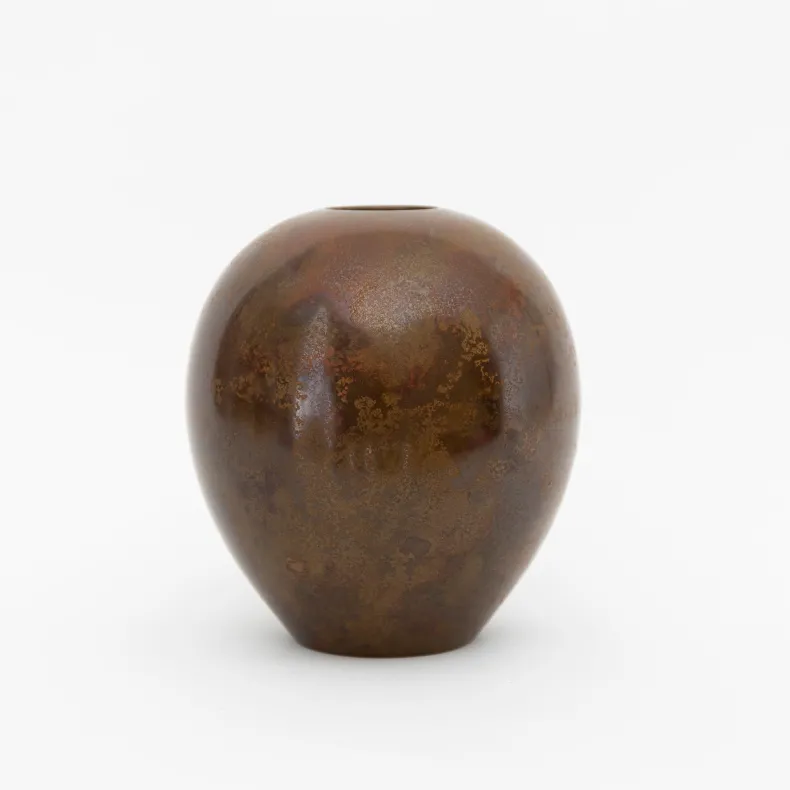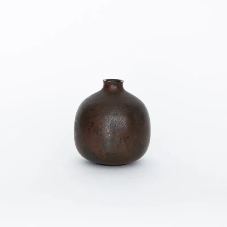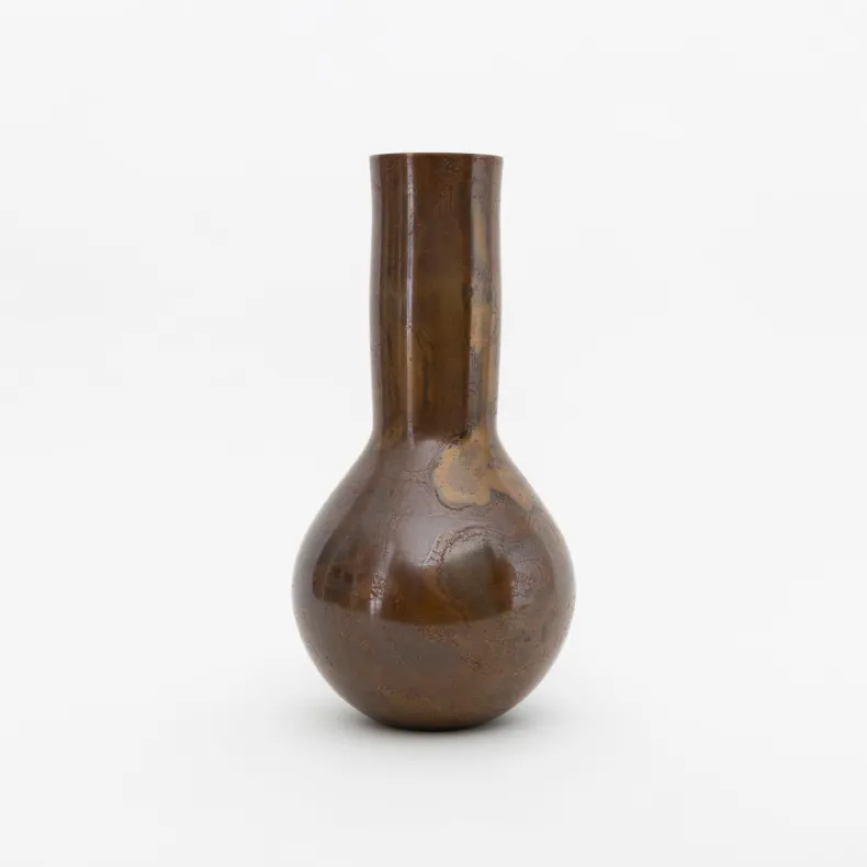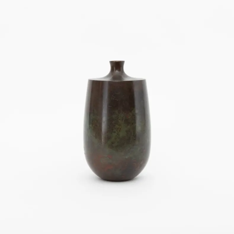 One-of-a-kind vintage vases circa 1980 from Japanese bronze artists. The unique patina swirls and patterns are caused by a natural oxidization process over the course of several decades. These heavy set vases willcontinue to achieve a soft and mellow patina over time, making them living pieces of art. Enjoy a beautiful bronze vase to hone your ikebana craft or display them simply as standalone pieces.