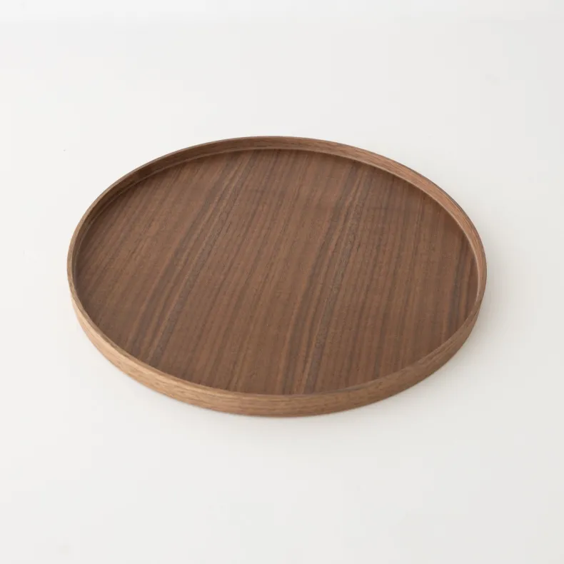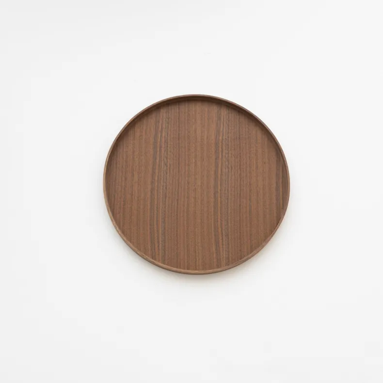 Presented in walnut, these featherlight round trays are ideal forserving beverages, tea, or coffee. They also excel at organizing items on a dresser or providing a stable surface on ottomans or sofas. Their innate simplicity renders them suitable for any interior setting for a wide variety of occasions.